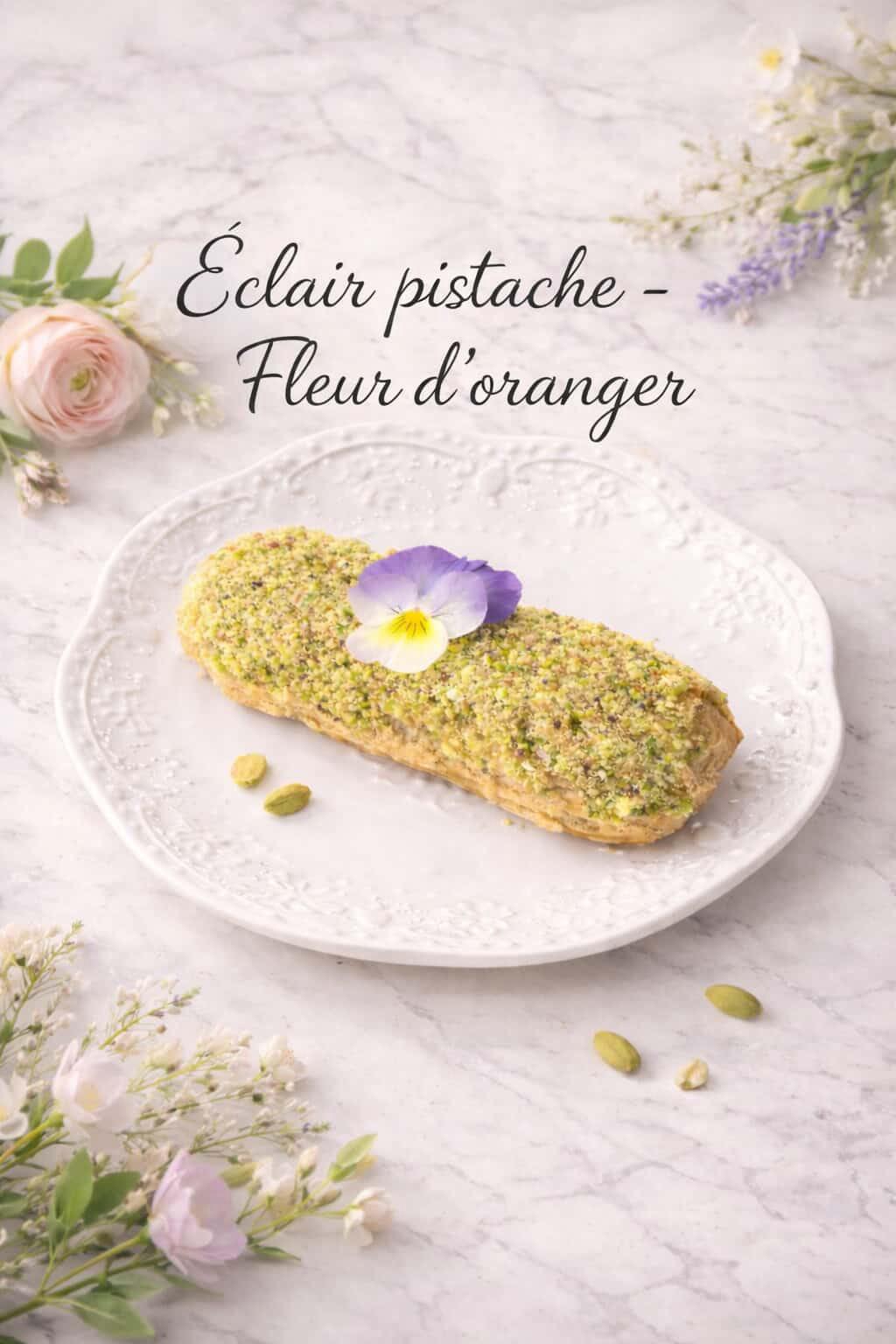 Une pâte à choux, un craquelin, une crème pâtissière pistache, un crémeux à la fleur d’oranger et pour finir une poudre de pistache