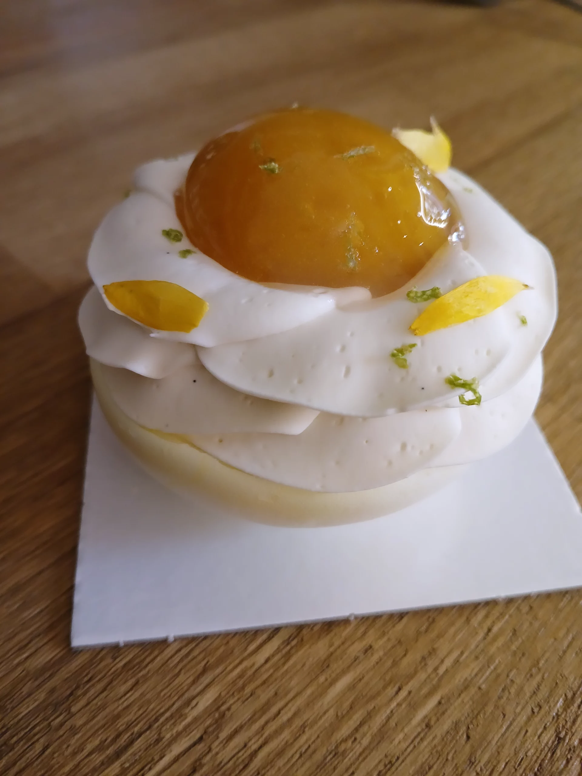 Meringue, confit mangue- passion, chantilly fleur de sureau et mangues fraîches