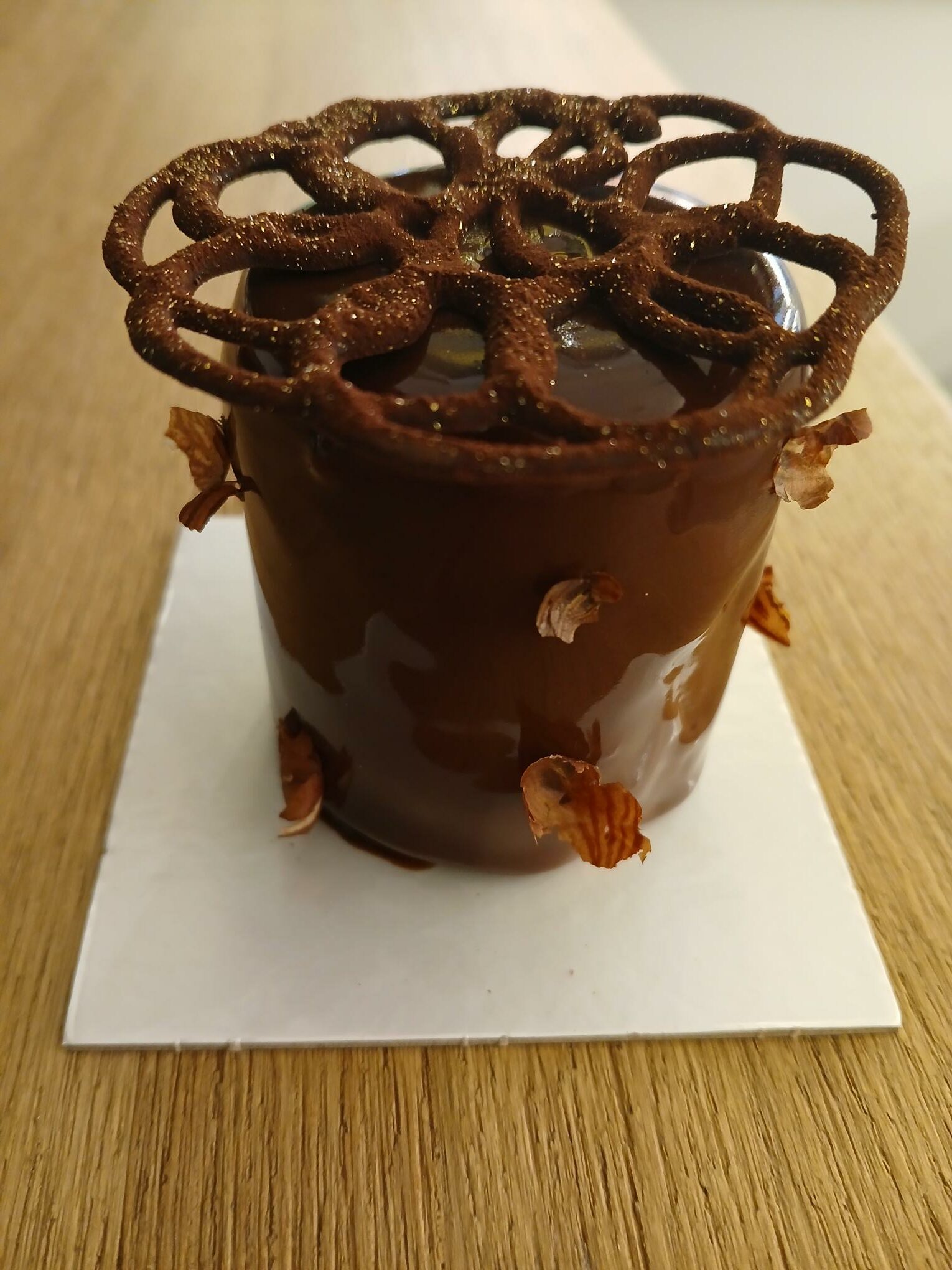 Mousse chocolat noir, insert crémeux à la fève de tonka, biscuit noisette et noisettes torréfiées. Sans gluten